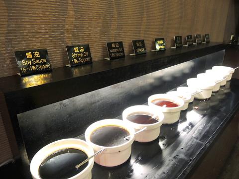 Next, I moved to the counter where various sauces were displayed. All the labels for the sauces are written in Chinese and English, with suggested amounts for each. A chef told me that soy-bean sauce, shrimp oil, sesame oil and rice wine were the most commonly used, so I took one teaspoon of each and added some garlic and chilies just to spice things up.