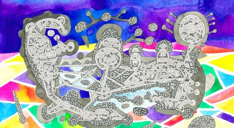 At solo show Balcony City Civilization Quotation (陽台文明城市語錄), Lin Shu-Kai (林書楷) makes maps of imaginary places that are based on Greater Tainan. He draws aerial views of cities teeming with temples, networked alleys and flowering fields — surreal scenes inspired by memories of home.