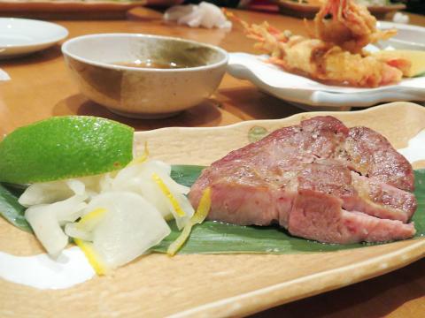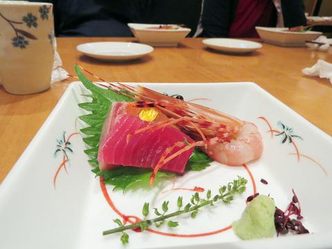 Next there is sashimi: tuna, salmon and a large botan shrimp with a ruby-red head, garnished with a flower. This is top quality fish. Each glistening piece has an ocean scent and is just chilled enough so that the texture is soft yet springy.