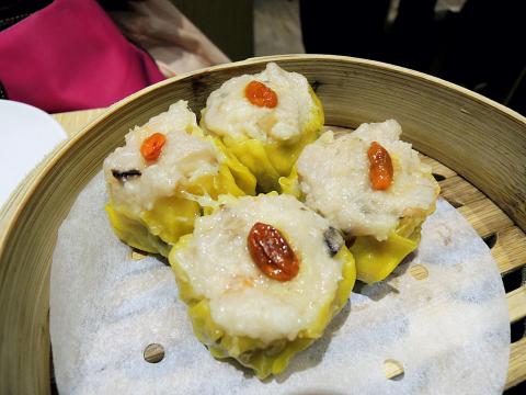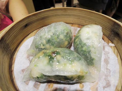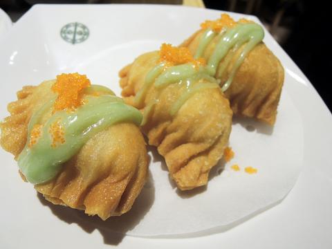 Online food critics recommend the spring rolls with egg whites (NT$98), spinach dumplings with shrimp (NT$98), pork dumplings with shrimp (NT$128), vermicelli rolls with shrimp (NT$128) and, most impressive, the wasabi salad prawn dumplings (NT$128). These prawn dumplings, which are bursting with shrimp, are deep-fried until golden and crispy, and then decorated with a dollop of green wasabi and fish roe.
