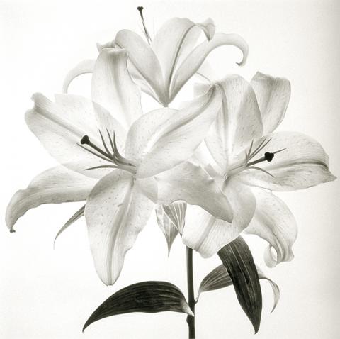 Three Lilies, by Cy DeCosse, is a photograph of a single stem with three blooms, each beguilingly detailed and luminous on the paper. On the leaves below, there is a depth of grays and blacks difficult to achieve with any other photographic process.