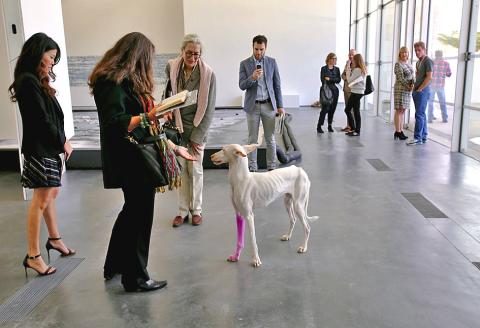 His works like Human, the white Ibizan Hound with the pink leg freely roaming the labyrinthine gallery of sharp diagonal walls, challenge easy definition.