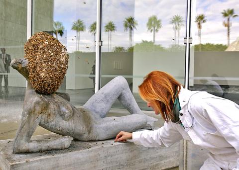 Visitors are also able to step out into the California sun as machines overhead dump fake snow, fog and rain all while thousands of bees swarm from a concrete classical sculpture of a lounging nude woman with beehive head, Untilled (Liegender Frauenakt).