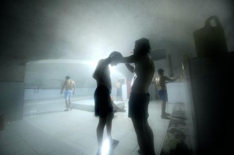 Next, I’m lying on a hot stone covered in giant soap suds while I’m scrubbed with oak leaves. It feels like I’m being slowly absorbed into a giant mince pie. Then comes the hose-down, steam and douche.