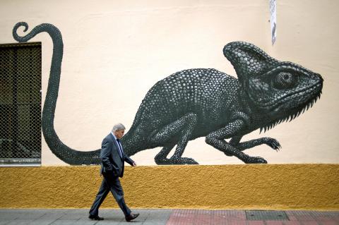 Antonio Mancera, 63, smiles proudly at the scaly chameleon design on the wall of his house by the Belgian artist Roa. He offers to show visitors around the district’s various murals.