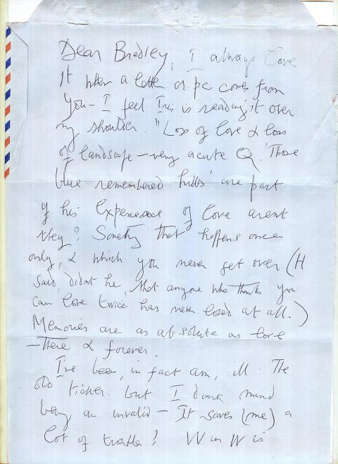When a letter or pc comes from you I feel Iris is reading it over my shoulder. “Loss of love & loss of landscape” [I’d asked him what he thought was the connection between these in Housman’s poetry]. ‘Those blue remembered hills’ are part of his experience of love aren’t they? Something that happens once only, and which you never get over.