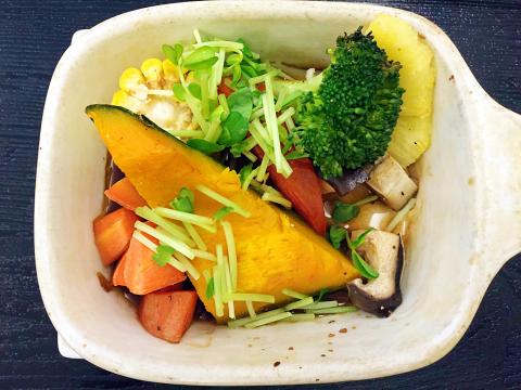 The rice with grilled mixed vegetables (NT$220) is a light and simple set meal. It’s recommended by the staff as the “healthiest” choice on the menu. Without much added sauce or garnishing, the natural flavors are brought out through contrasts in the different types of vegetables served such as pumpkin, corn, tomatoes, mushroom, broccoli and alfalfa sprouts — all grown from a farm in Yunlin County (雲林) in western Taiwan. One way to know that you’re eating a nutritious meal is by ensuring that there are different colors of food on your plate — and this set certainly achieves that. The natural sweetness of the pumpkin and corn balances the plainness of the other vegetables.