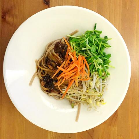 Rice Revolution’s buck wheat noodle sets (NT$220) are minimalistic in design and flavoring. There are two choices of sauce — spicy bean paste and toon sauce (香椿醬). Both are cooked with the same garnishing — shredded carrots, bean sprouts and alfalfa sprouts. The bean paste is only mildly spicy and tastes like a more subdued version of zha jiang mian (醡醬麵) or noodles with meat sauce. Only the ground pork is replaced with beans, giving it a softer texture.