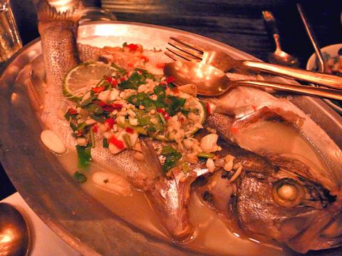 Delectable tidbits such as deep-fried fish cake (炸魚餅, NT$120) and deep-fried chicken feet (炸雞爪, NT$120) are common street foods in Thailand. Eaten with chili peppers, garlic and slices of lettuce, the sour pork sausage (烤東北酸香腸, NT$160) was a fun treat but not as tart-tasting as its name suggests.