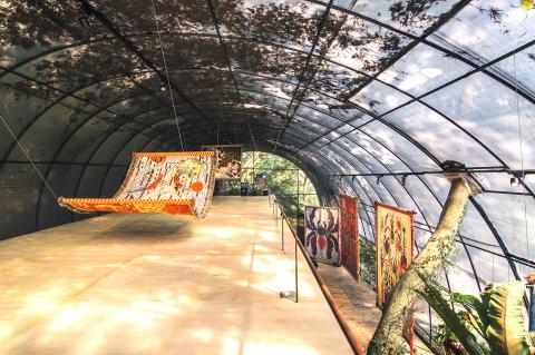In the mountains surrounding the Taipei suburb of Waishuangxi (外雙溪), an otherworldly exhibition is being shown in a rather peculiar space. Ornate tapestries in intricate colors and psychedelic designs that depict surreal creatures hang from a ceiling that is sheathed, like the entire structure, in black agricultural netting.