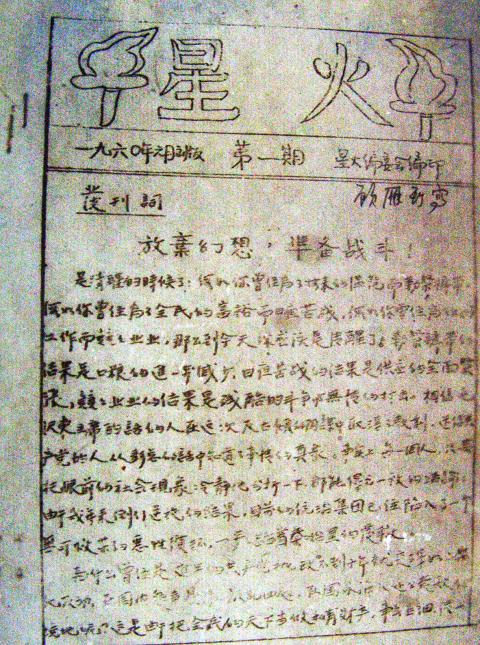 His 2013 Spark (星火), for example, explores the story behind Sparks of Fire (星火), the only surviving underground periodical from the time of the Great Leap Forward, an economic and social campaign led by Mao Zedong (毛澤東) that led to the Great Famine. The film won the top prize at last year’s Taiwan International Documentary Festival (台灣國際紀錄片影展).