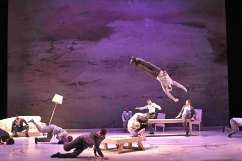 The Roots is billed as “a human adventure,” although the stage is set with the most ordinary of human accessories: tables, wooden chairs, armchairs, a sofa, floor lamps, a record player and a radio. However, what Accrorap’s 11 men get up to among those items truely is adventurous — and probably should come with a warning that the moves should not be attempted by viewers in their own homes.