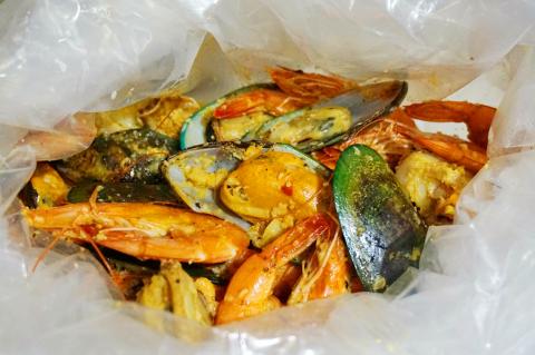 Their efforts paid off because the restaurant, which opened in February, was packed on a Tuesday night when a friend and I dined there. The most popular pick is, of course, the seafood bag, otherwise known as their “BS Combo” where customers choose from an assortment of clams, mussels, white shrimp and Hokkaido scallops. Sauce-wise, the lemon zing is recommended for those with lighter palates, while the Brookhurst bang and Cajun sauces are better suited for those who can take the garlic. The spiciness of the sauce can also be adjusted. The smallest combo, the shrimp and shells (NT$999) feeds two people, while the largest combo, the big catch (NT$5,990), which comes with king crab legs, Boston lobster and a selection of shrimp, is suitable for large groups. There is a generous selection of add-ons on the menu, including veggies and meat. The German and smoked sausages (NT$80), which I had, is a fine choice. However, the meal isn’t complete without something to slop up the sauce with. For that, I ordered slices of French baguette (NT$30).