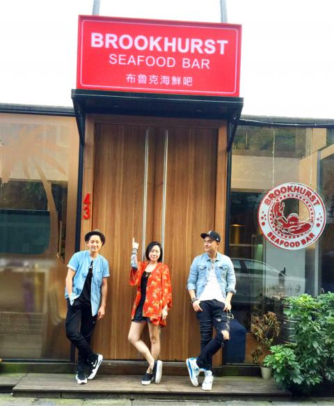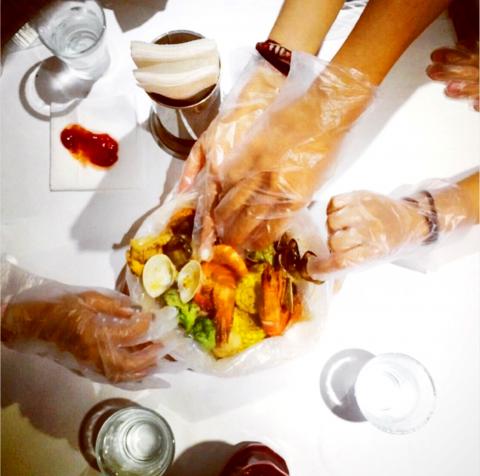 The owner of the restaurant, Taiwanese-American Wendy Wu (吳欣穎), came up with the concept she calls “grub and chug,” on a trip to Los Angeles last year when she dined at The Boiling Crab, a joint serving seafood in a similar fashion. She wanted the food at Brookhurst to be served with less butter though, and thought it would be helpful to provide gloves and cellphone bags so that diners could still go through their usual routine of uploading food pictures to Facebook and Instagram.