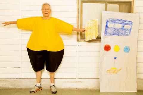 An elderly man is dressed in a cartoonish, oversized, bright yellow and black costume. The props are all blown-up, life-size cutouts of crayon drawings of objects such as a water dispenser.