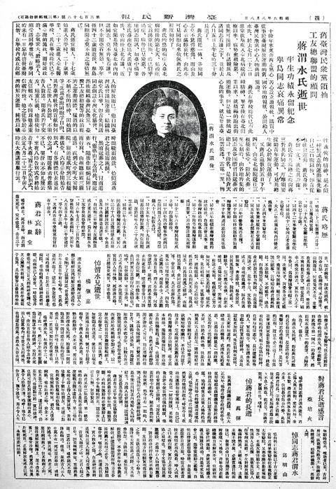 On Aug. 5, 1931, Chiang Wei-shui (蔣渭水), an outspoken Taiwanese nationalist during the Japanese colonial era, passed away from typhoid after more than two weeks in the hospital. The man would later be considered a pioneer of Taiwanese democracy and one of the most important leaders of nonviolent resistance against Japanese rule.