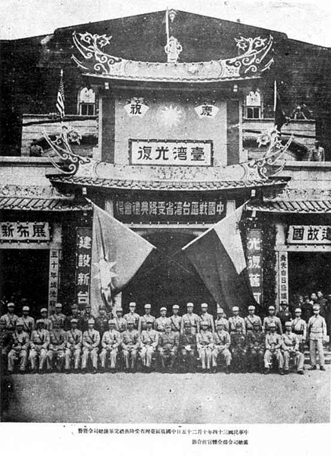 Although KMT leader Chiang Kai-shek (蔣介石) appointed Chen Yi (陳儀) as governor general of Taiwan on Aug. 29, Chen didn’t land until Oct. 24. The next day, he formally accepted the Japanese governor-general’s surrender.