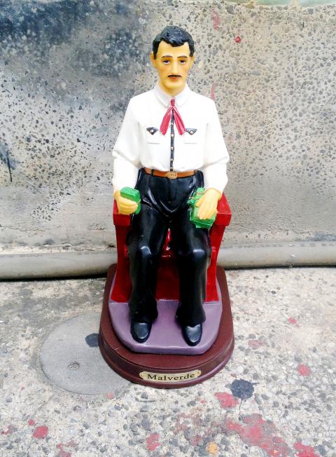 The installation, Jesus Malverde, the Patron Saint of Mexican Drug Traffickers (耶穌 · 馬維德:墨西哥毒販的守護神), is modeled on a shrine devoted to the narco-saint Jesus Malverde. Mexican drug traffickers will pray to Malverde before embarking on their dangerous trips to the US. Above the chapel, Chen and Hong have created an altar containing photographs of drug dealers being executed by the authorities.