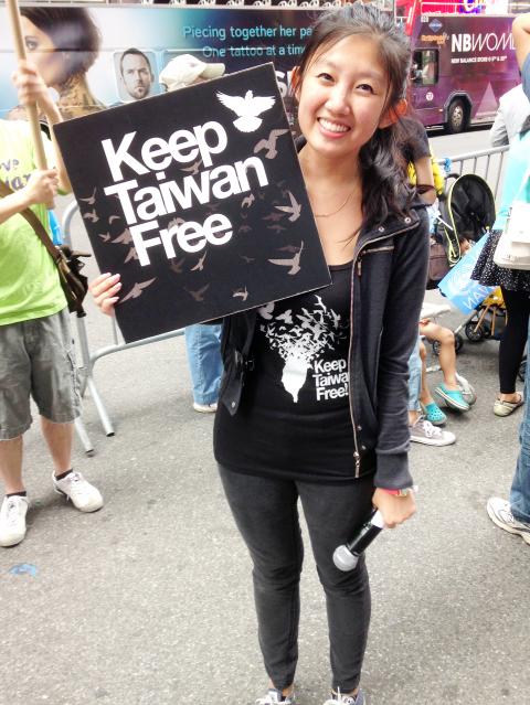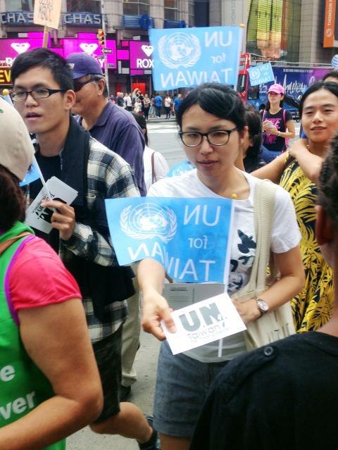 “Every year, we’re gonna shout, we’re gonna fight and we’re gonna be heard,” Outreach for Taiwan co-founder Jenny Wang (汪采羿), one of the organizers, screamed through a microphone as more than 100 people, penned in by New York Police Department metal barricades along Seventh Avenue near Times Square, waved baby-blue “UN for Taiwan” flags.