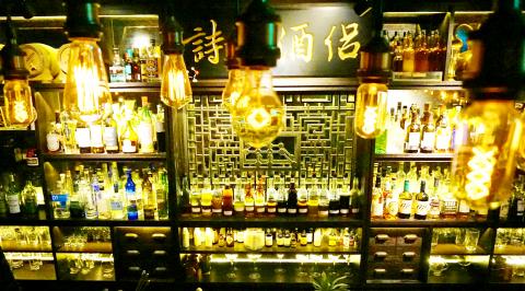 Inside, medicine cabinets line the wall behind a narrow wooden bar. Displayed on the shelves are bourbons, bitters and a row of infusions with labels such as “black tea vodka” and “green tea gin.” On the wall are four characters: 詩朋酒侶 (shi peng jiu lu), which means to enjoy good alcohol with good friends.