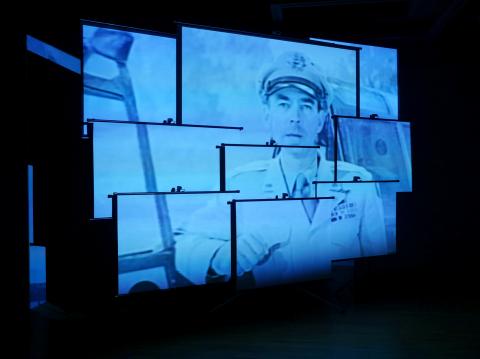 On a number of home movie screens assembled to form one large screen, footage from World War II movies from the era depict Japanese as brutes and killers. Across from it, an old TV set plays a compilation of commercials from the 1950s.