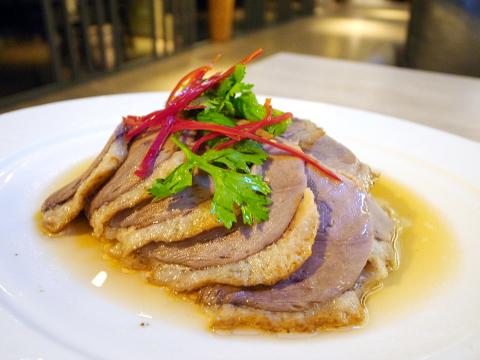 On a recent weekend at the packed restaurant, our party began with duck tongue cooked in Shaoxing rice wine (醉香鴨舌, NT$150). Served deboned, the dish is not as scary as its name suggests, and the long-lasting aroma of the spirit adds a robust finish. Chang Ju’s rendition of the soy-marinated goose meat (潮州滷水鵝, NT$480) was spot on, with the meat firm yet tender.