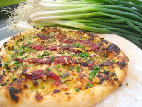 3. Prepare your pizza base. Spread a thin layer of the onion puree on the base, just as you would a tomato sauce. Scatter this topping with a liberal quantity of the scallion and garlic mix.