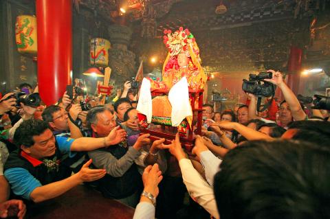 The 11-day pilgrimage will take in a 200km round trip to Chao Tian Temple (朝天宮) in Beigang (北港), Yunlin County, and back. The arrangements, says the temple’s current director, Chen Chun-fa (陳春發), are 70 percent decided by the goddess, 30 percent by the temple committee.
