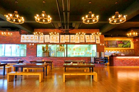 The first floor tasting area boasts red brick walls and wooden tables, chairs and floors, as well as windows for patrons to take a peek at the various tanks that are used to brew the beers. On display near the bar with 12 taps is Sung’s home brewing equipment — a reminder of his humble beginnings.
