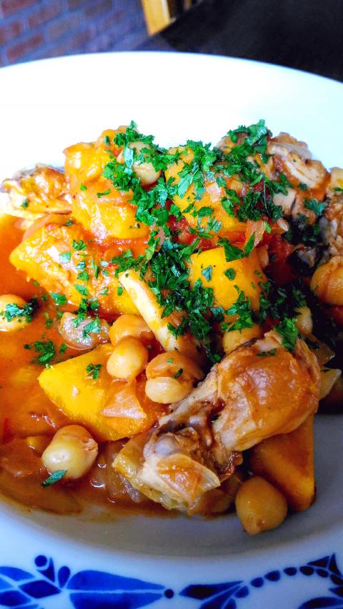 This dish is based on a North African dish, tbikha, which according to Claudia Roden, a great authority on Mediterranean cooking, is really just any mixture of vegetables, fresh or dried, cooked together with chickpeas or beans. For me, the tomato and chickpea mix is perfect for dialing back the richness of the kabocha. A mix of cinnamon, Thai chili and sweet pepper has replaced harissa, often used in authentic versions of tbikha, as this North African hot paste is not readily available in Taiwan.