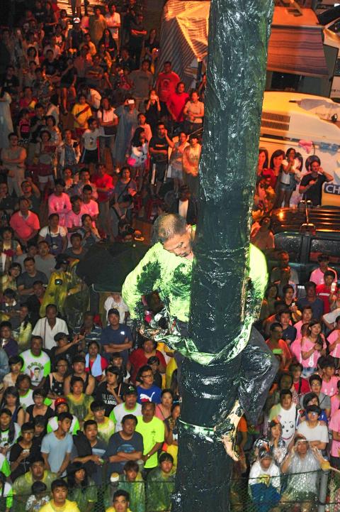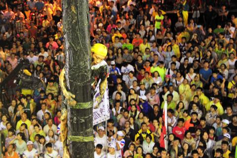 There will be two competitions — beginning with an easier fanpeng (飯棚) challenge to provide rice to the ghosts, followed by the main gupeng (孤棚) event with duck, fish, pork and other offerings. For the main challenge, teams of five people will race to climb 13m-tall greased poles with the help of ropes and make their way up to the main platform, where offerings can be obtained on 30m-tall structures located above the platform. To win, they must obtain the flag on the very top. About 120 gallons of butter is reportedly used that night to grease the poles.