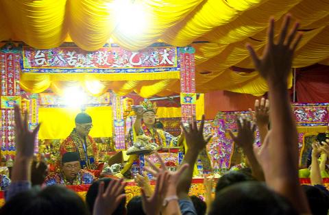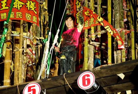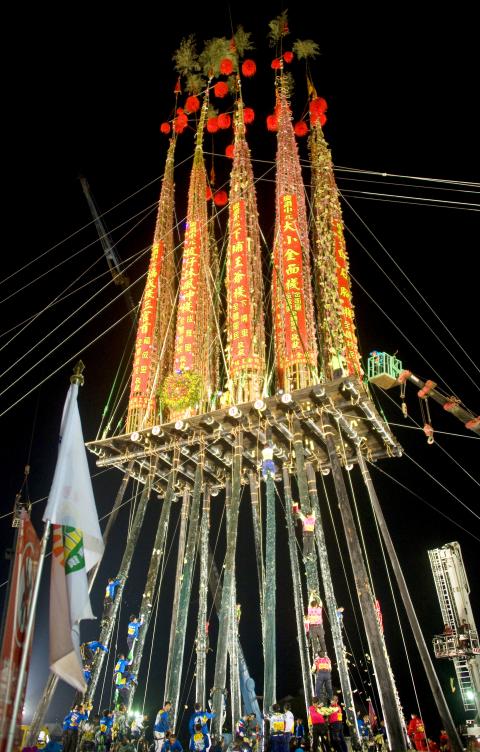 Last Wednesday, on the last day of Ghost Month, a newly-erected 43m structure could be seen from most parts of Yilan’s Toucheng Township (頭城). Known as a gupeng (孤棚), the bottom consists of 16 fir logs supporting a wooden platform, upon which 13 bamboo towers measuring 30m tall and laden with offerings such as duck, fish and pork point toward the sky. On the very top is the victory flag tied to a large branch.