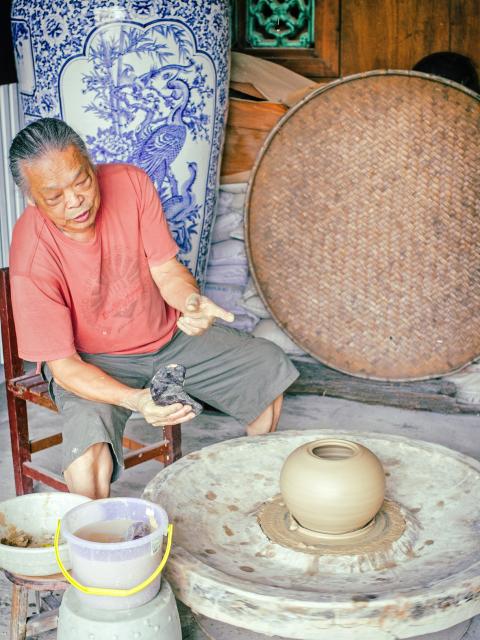Wu Cheng-hung (吳正宏), 77, is the 23rd generation of a line of potters that started in Cizao Township (磁灶鎮) in 5th century China. His grandfather, Wu Ji (吳及, 1878 to 1949), left Cizao at the end of the Qing dynasty to make a living in Taiwan, bringing the coiling technique and kick wheel technology practiced in Cizao with him. When Wu visited his ancestral town in 1999, he discovered that the traditional pottery industry there had all but disappeared.