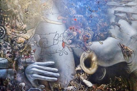 Ventura’s oil paintings, like his installations, are layered and intricate. He paints in a manner that is hyperrealist, overlaying cartoons and graffiti with sketches of people and bodies. In a way, it’s alluding to the muddled national identity of the Philippines, a country which has been repeatedly colonized by foreign powers.