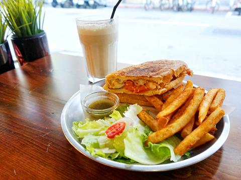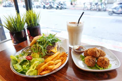 Normally, I detest side salads in burger joints — my theory is that they’re just slapped on to make customers feel less guilty of ingesting so much red meat — but Mount Kao’s isn’t bad. For one, it doesn’t come with overly sweet dressing, but with a tasteful dollop of vinaigrette instead, separate from the salad. The burger also comes with a side — either fries, wedges or sweet potatoes. I choose the fries, thinking that sweet potatoes with burger might be an odd combination. It’s a good choice as the fries are warm and crispy. All of this I wash down with a banana milkshake topped with cinnamon (NT$110), which is rich, creamy and divine.