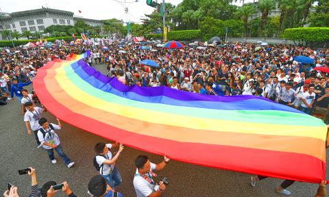 “Save the family!” read the placards held by the protesters, who shouted slogans such as “homosexuality is contagious,” “each gay has 1,000 sex partners” and “legalizing same-sex marriage is [no different than] legalizing orgies.” The situation became even more chaotic when dozens of protesters broke into the Legislative Yuan to interrupt the review, demanding that more public hearings be held.