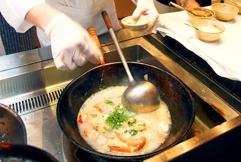2. Add lemon grass, galangal, ginger, chilies, lime leaves, sugar and fish sauce. Simmer for 20 minutes. Add coconut milk, then taste broth for salt and adjust. (You may prepare up to this point 1 to 2 hours in advance and leave at room temperature.)