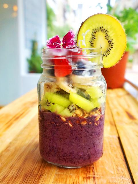 Never mind the hefty price (NT$310), order the Acai Jar. Purple Passion powder is mixed with banana, almond milk, honey and acai fruit to create a luscious and refreshing drink with hints of natural sweetness. This is topped with kiwi, bananas, strawberries and granola. The trick is to mash it all up for the flavors (sweet, savory) and textures (soft, crunchy) to blend.
