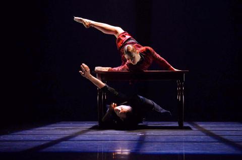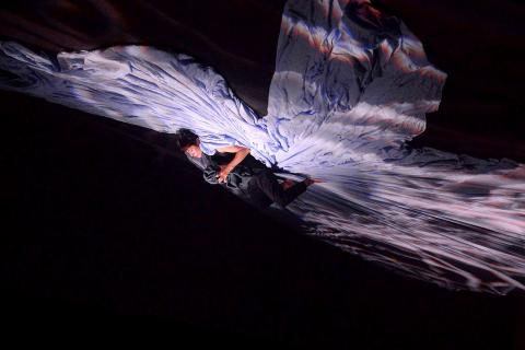 The program finished on an equally strong note: Wang Kuo-chuen’s (王國權) Ku shan shwei (枯山水), a very adult pas de trois featuring Ally Yeh (葉麗娟) and Tseng Ting-kai (曾鼎凱). It opened with Tseng’s very dramatic dropping of stones and Wang’s slow, swirling contraction of a large dropcloth on the floor, before focusing on the very Audrey Hepburn-looking Yeh, who divided her attention between the two men.