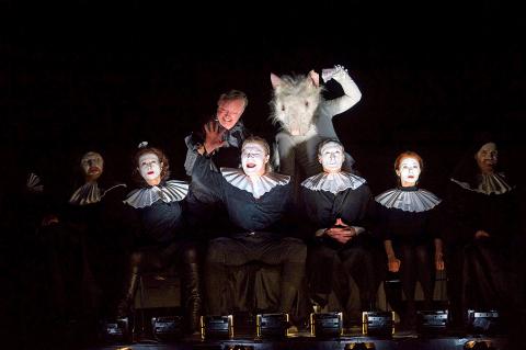 It was the details that nagged at me. Why was there a creature in Act I, costumed in a large black cape, big black neck ruffle, black bondage hood and red-lit nose bulb crawling around the stage like some huge misshapen mastiff, complete with the occasional growl?