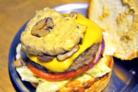 I’ve fallen victim to novelty burgers before, but it’s still hard to resist ordering the sweet chestnut burger our of curiosity. To be fair to the restaurant, we also order the standard Mozzarella mushroom burger (NT$220). There are six sets — we choose B (NT$85) which comes with a drink and basil fried chicken, and E (NT$110) which comes with a drink and salad. Patrons can also add items a la carte to the burger and salad (between NT$20 and NT$60).
