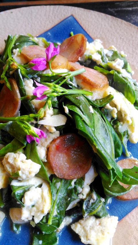 It’s a bit of a cheat to offer an omelet as a recipe, as who doesn’t know how to toss some eggs into a pan with a few bits and pieces. That said, through various experiments in the kitchen, I have found that talinum is a perfect example for the old adage that “less is more.” The less you mess with it, the better it tastes, making for a skillet meal that comes together in minutes. The egg also seems to mitigate the talinum’s mucinous quality, making the dish more acceptable to children (in very limited home testing). The addition of thin slices of spicy Hunan sausage completed this dish for me, and some robust chorizo would probably prove just as effective.