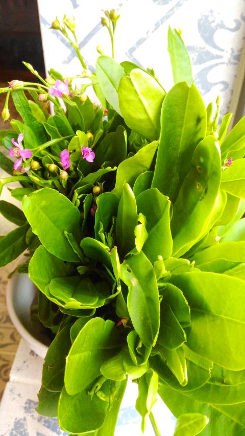 The search for fresh local green things to put on a plate continues at our home in Hualien and it is an endless surprise what can be discovered with just a little exploration along the fringes of local traditional markets. Talinum (土人蔘, 巴蔘), my most recent discovery, has proved a great success and has become part of the family diet. Like tetragon, which we looked at early this month, it is sometimes regarded as a substitute for spinach, but really, it doesn’t need to be a substitute for anything and has many interesting applications in the kitchen.