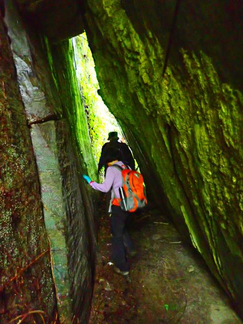 A path (very overgrown but still just passable) leads right behind Guanyin Waterfall, and another arched bridge, guarded at each end by a pair of Chinese lions and half covered by undergrowth, spans the point where the tributary below the waterfall joins the main stream. A trail branches off this path, climbing the steep hillside, passing through a natural tunnel-like cleft in the rock to reach the remains of an old adventure playground in the woods. A little further is one end of a long-since fallen zip line that once spanned the gorge.