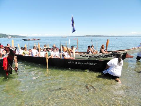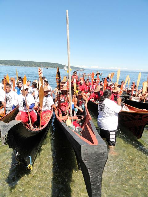 There aren’t enough funds for Lamuran to bring his own canoe, but he still has a chance to navigate the waters of the Pacific Northwest. Smoke says that due to the large number of participants, canoe families are formed so different groups can take turns “pulling” the canoes, the preferred Native American term, rather than “paddling” or “rowing.” Lamuran met his canoe family on Monday.