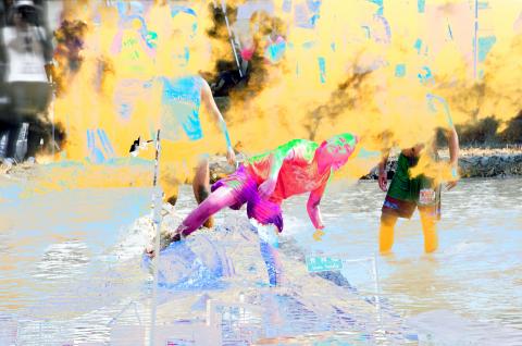 Li Ei-chen’s (李翊誠) two-dimensional mixed media work can be seen at the show, Not Pleasant Not Contemporary (不討喜不當代). Combining photos he took documenting the 2014 gas explosion in his native Kaohsiung with silkscreen prints, Li’s works are indeed not pleasant. Almost in a tone of dark humor, he explores the different states of mind he has toward his hometown. The resulting colorful, semi-abstract collages serve as a compass that points his way back home.