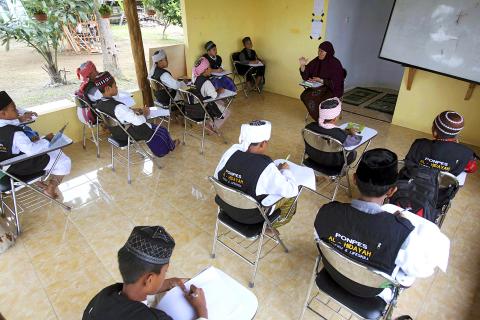 Sitting in a classroom just after dawn with students whose ages range from 9 to 15, Ghazali tells them stories about the life of the Prophet Muhammad to show them, he said, that Islam is a religion of love and mercy, not an ideology to justify a war against police, currently the most frequent target of militant attacks in Indonesia.