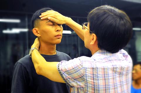 The two are standing in a basement dance studio in downtown Taipei. A man holds a large bowl of water behind Wang Kuo-liang, who dips his hands in it and places one hand on his daughter’s forehead and the other on the back of her neck.