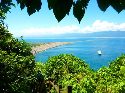 Turtle Island is a relatively young landform, created, our guide said, about 7,000 years ago from two volcanoes, which rose from the ocean floor. Over the course of at least four eruptions, they merged to form the distinctive shape of the island — two highlands divided by a low-lying “neck.”