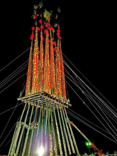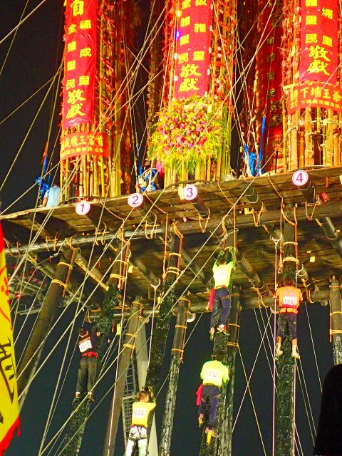 The ritual venue, on the southern edge of town, is dominated by a great tower called a gupeng (孤棚). The lower portion consists of 12 thick poles nearly 20 meters tall, made from the trunks of fir trees; the trunks are liberally greased with beef fat to make climbing them even harder. On top of these is a large platform on which stand 13 towers made from multiple lengths of bamboo bound together, soaring into the floodlit night air. Various offerings such as dried squid, glutinous rice dumplings and pastries are tied to the poles. At the top of the towers are 13 “fair wind flags” (順風旗).